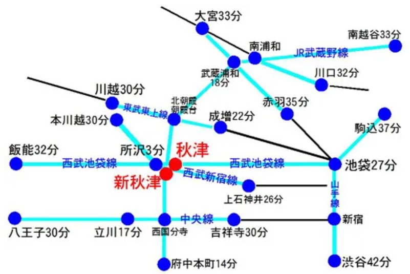 水色の沿線の駅から秋津・新秋津駅までの所要時間の目安です。